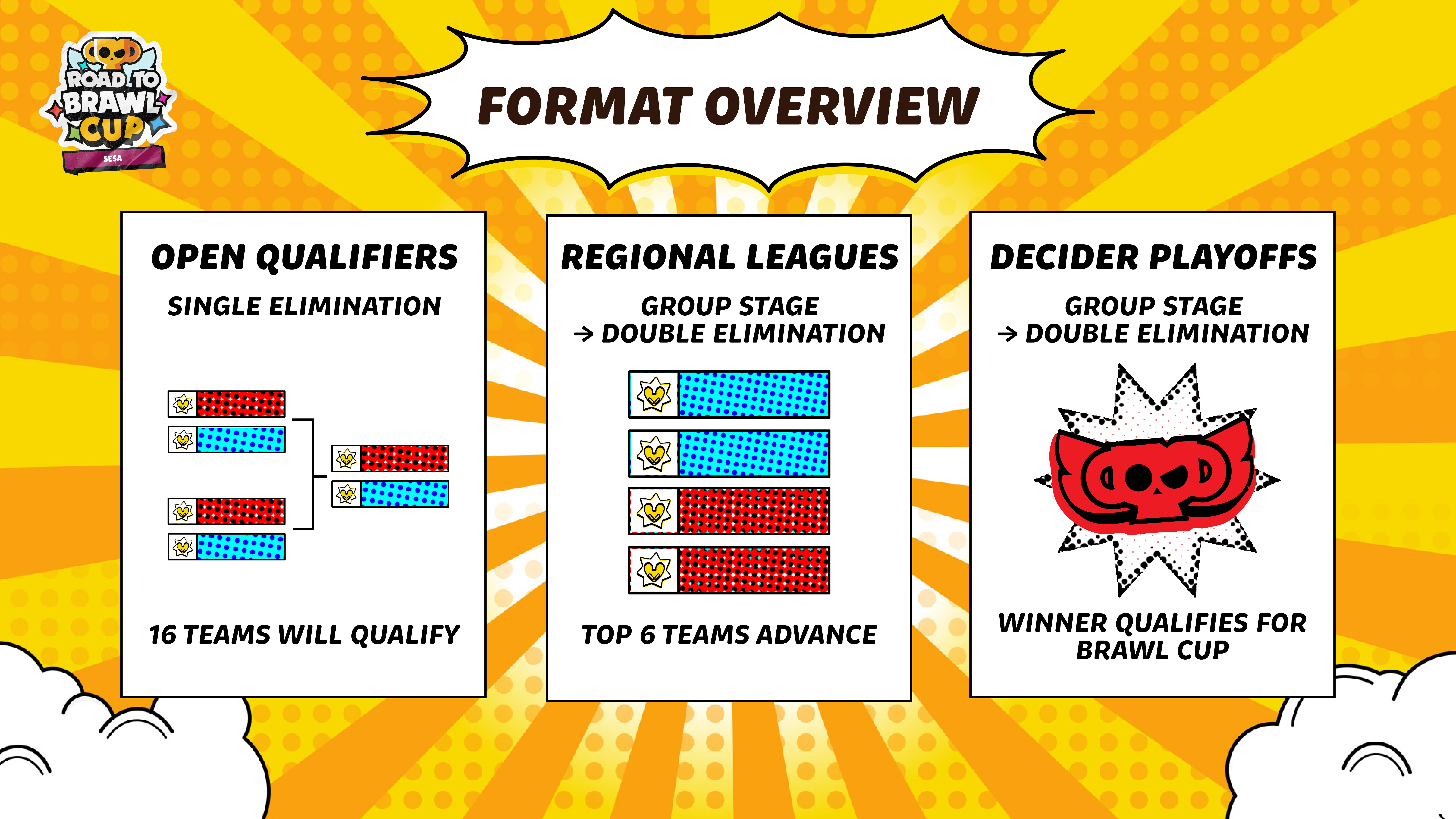 In this final two-day event, the 6 remaining teams will be narrowed down to 4 during an intense group stage. On the final day, representatives from South Asia and South East Asia will face off in a double-elimination bracket to determine the tournament champion, who will receive an invitation to the Brawl Cup.