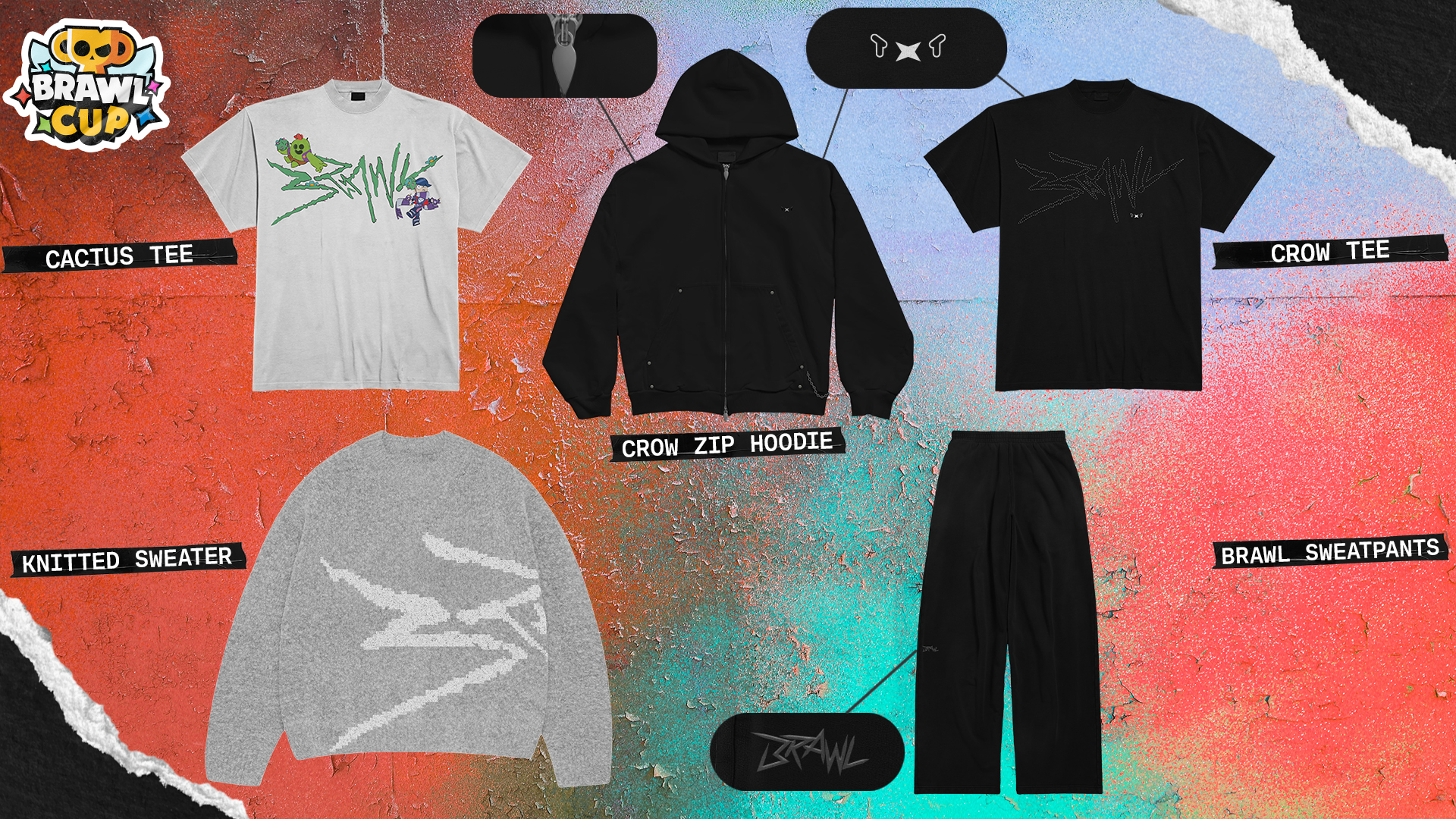Included in your Starr Package are 2 pieces of Brawl Stars merch: Crow Zipped Hoodie & Spike + Edgar White T-Shirt.