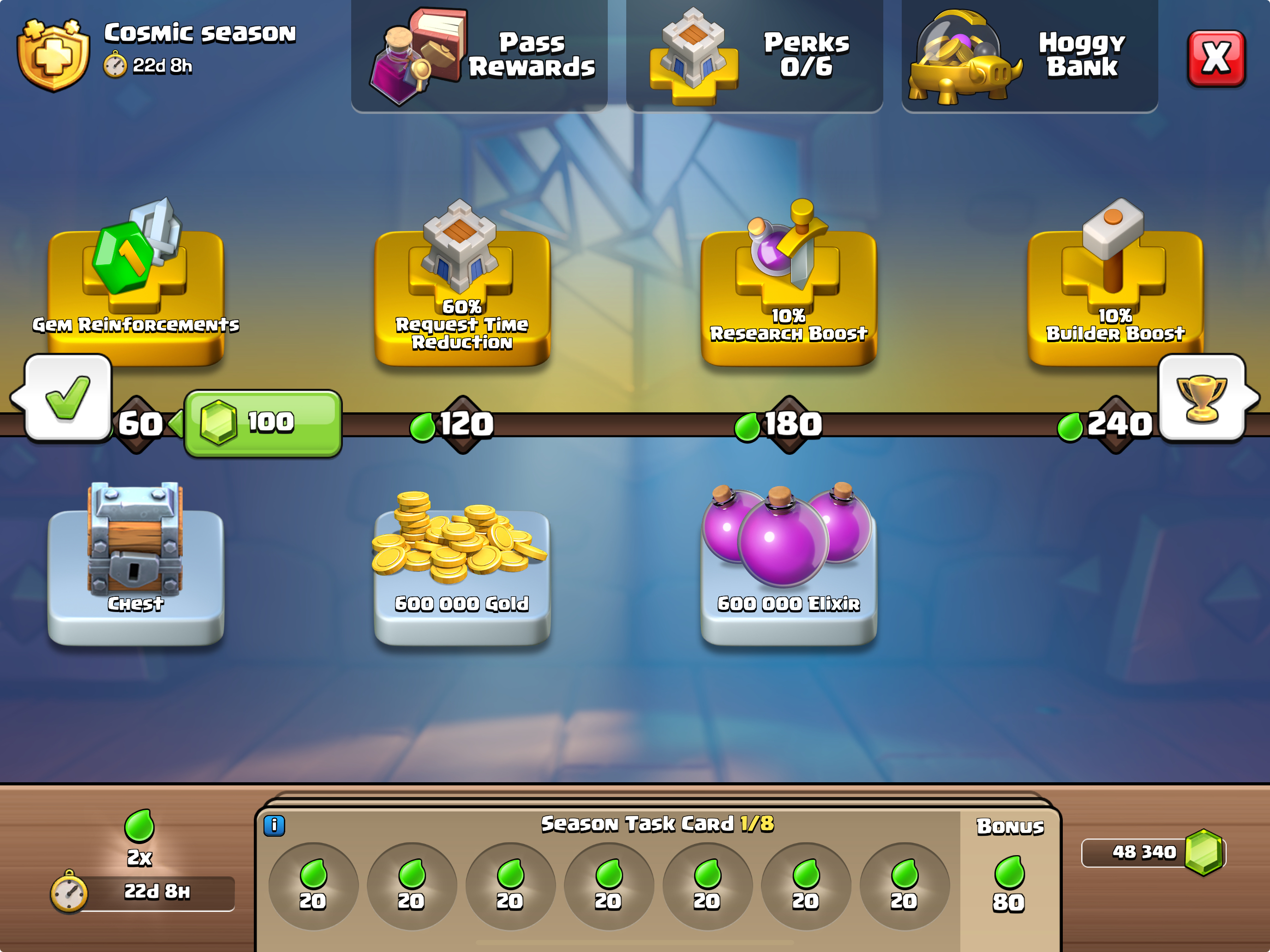 All rewards on the Season Pass scale based on your Town Hall and Builder Hall levels at the start of the season. This includes resource rewards, Chest contents, and the Hoggy Bank too.