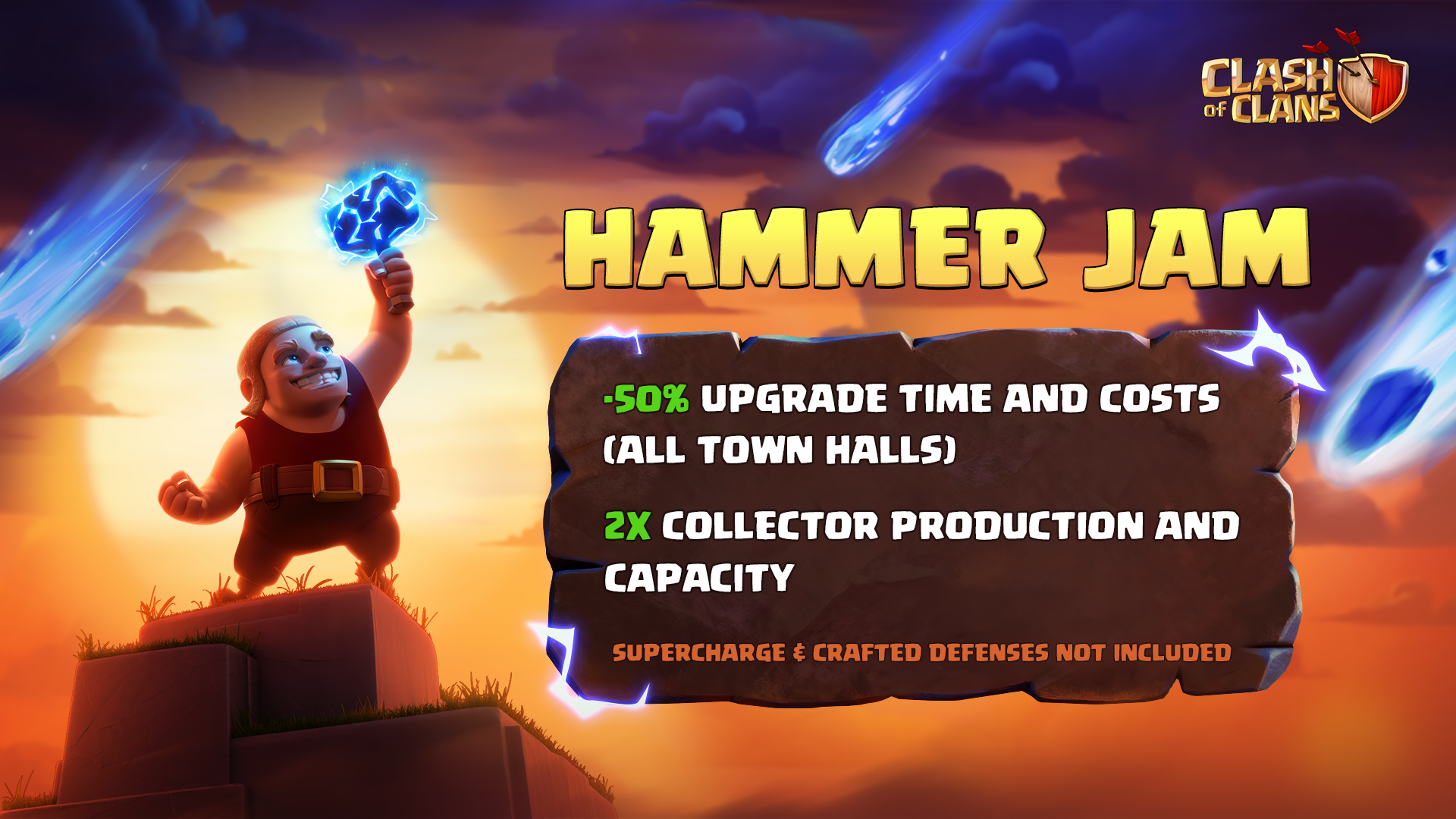 November 1-17: Hammer Jam returns! Enjoy 50% off upgrade timers and a 2x boost to Resource Collector capacities and production. Supercharges and Crafted Defenses are not included.