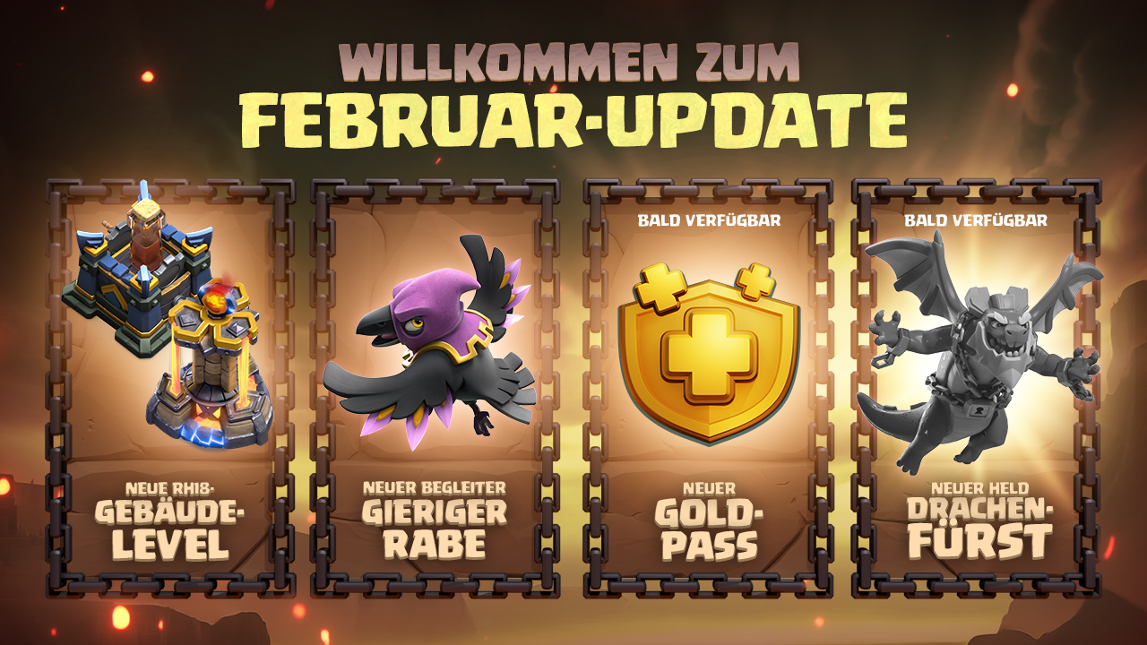 Das Februar-Update ist raus und bringt eine umfassende Überarbeitung des Goldpasses, glänzende neue Rathaus-Level-18-Verbesserungen, frische Verteidigungsanlagen, einen neuen Begleiter und jede Menge cooler Neuerungen ins Dorf. Es gibt sogar einen geheimnisvollen neuen Helden, der einen äußerst dramatischen Auftritt hinlegen wird.