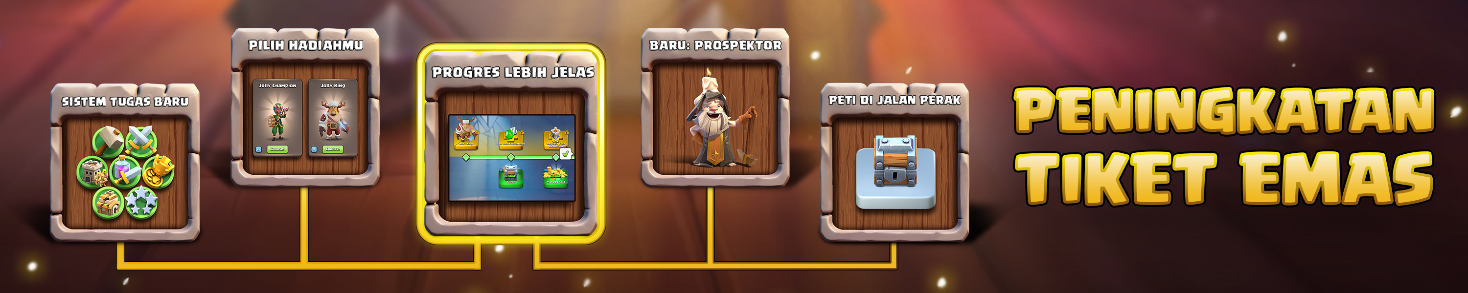 Pembaruan ini dibuat agar Tiket Emas lebih modern, lebih menarik, dan lebih sesuai dengan cara bermain Clash saat ini baik kamu bermain gratis, Pemain Tiket Emas, dan di tengah-tengahnya.