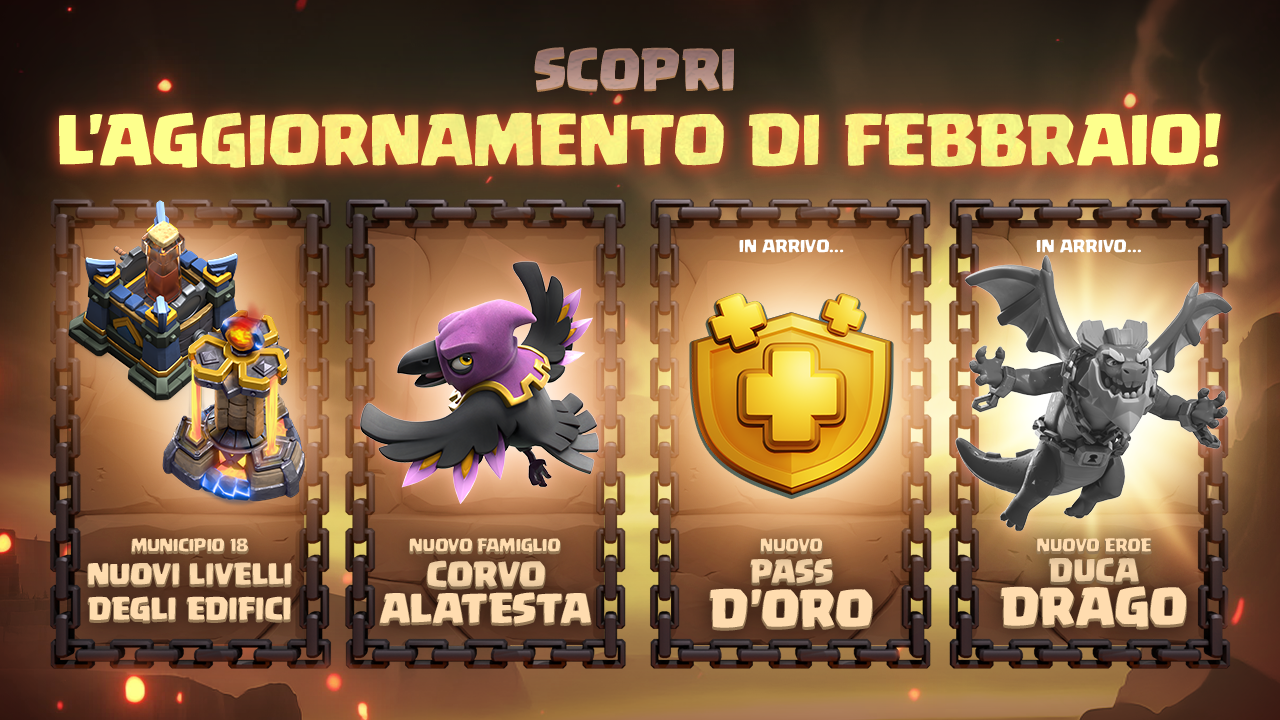 È arrivato l'aggiornamento di febbraio, con cui puoi goderti un Pass d'oro rivoluzionato, nuovi miglioramenti per i livelli del municipio 18, nuove difese, un famiglio, altre novità incredibili per il villaggio e persino l'arrivo di un nuovo eroe misterioso.