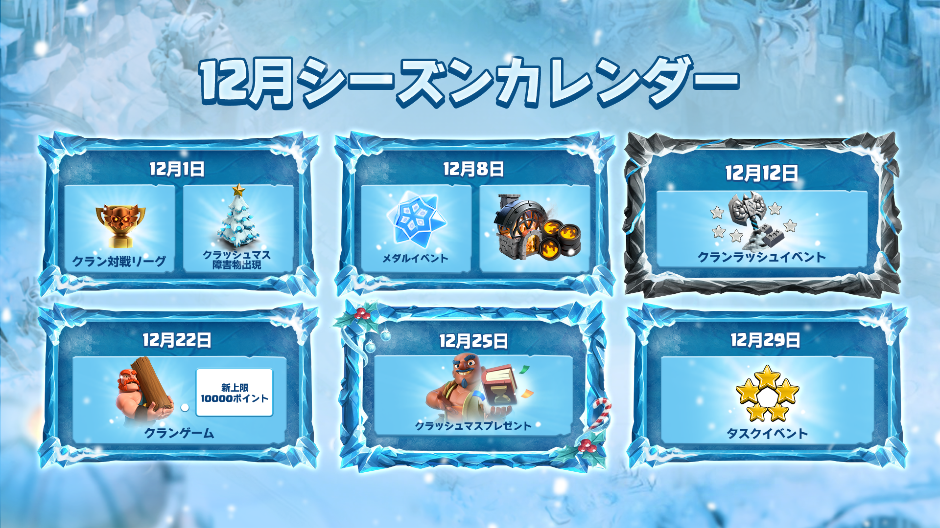**12月22日~28日:**クランゲームが新仕様と共にカムバック!クランで協力してタスクに取り組み、ポイントを獲得して報酬をアンロックしましょう。大男の計らいで、今シーズンは稼げるポイント数が4000ポイントから10000ポイントへと増加しているため、アクティブメンバーが少ないクランでも報酬をアンロックしやすくなっています。クランゲーム終了時の追加報酬のアンロックには、これまで通り4000ポイントが必要です。