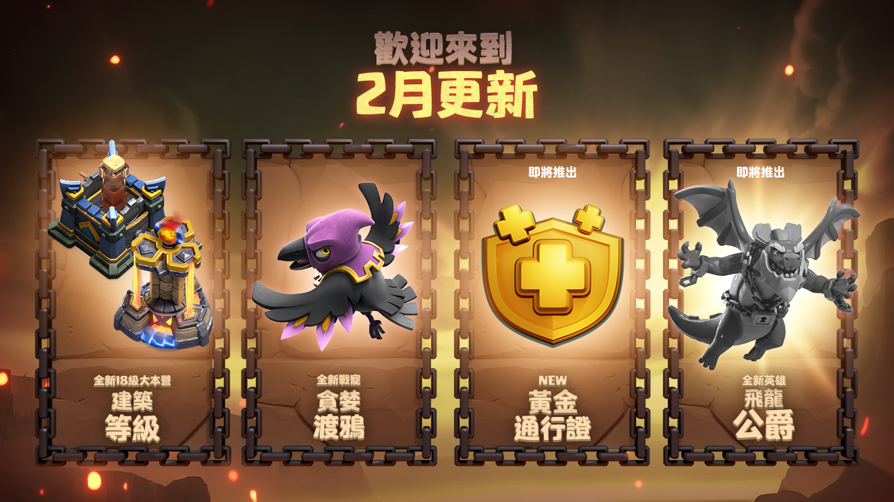 2月更新出籠囉!內容包括黃金通行證的全面重製、18級大本營全新升級內容、新防禦建築、新戰寵,以及村莊各方面的一大票酷炫優化調整!別急,以上還不是全部更新內容——還有一位神秘的新英雄,也即將以超戲劇化的方式登場!