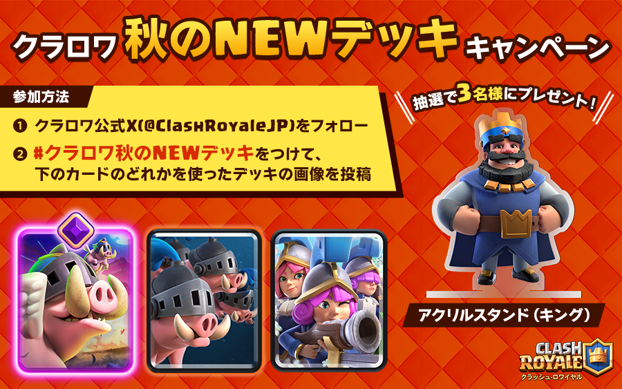 クラロワ公式(@ClashRoyaleJP)をフォロー後、「#クラロワ秋のNEWデッキ」をつけ、ロイヤルホグまたは三銃士を使ったデッキの画像をXで投稿すると応募は完了となります。
