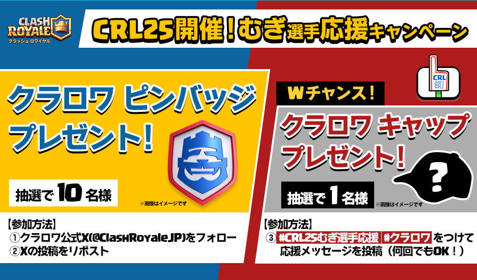 また、「#CRL25むぎ選手応援 #クラロワ」と一緒にむぎ選手への応援メッセージをXに投稿することで、Wチャンスに応募できます。